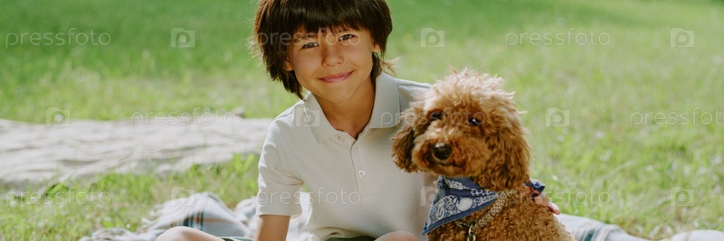 Портрет мальчика-подростка, сидящего на улице и улыбающегося коричневой собаке