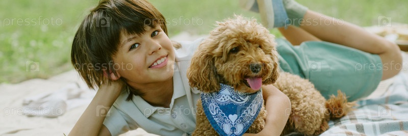 Бирациальный мальчик-ребенок улыбается, лежа на одеяле На улице с собакой