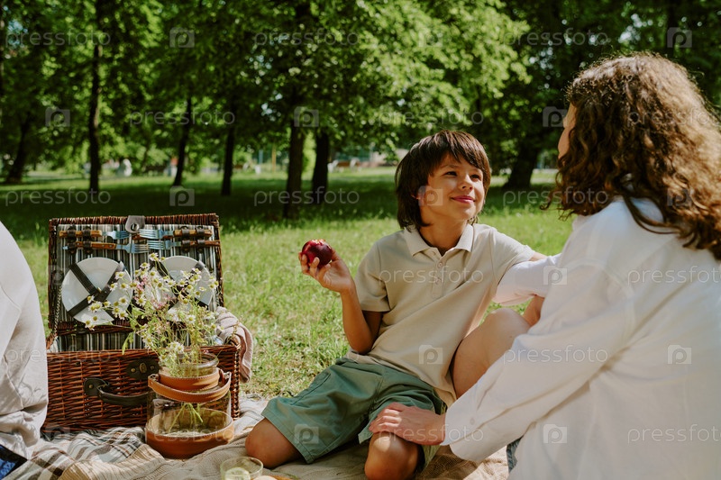 Женщина и мальчик наслаждаются пикником вместе в солнечном парке