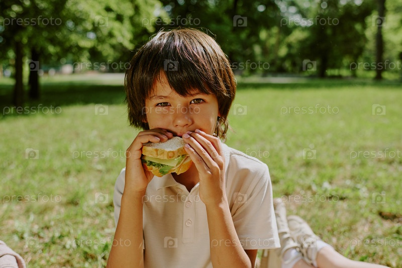 Портрет бирациального мальчика, съедающего бутерброд, сидящего на улице в парке