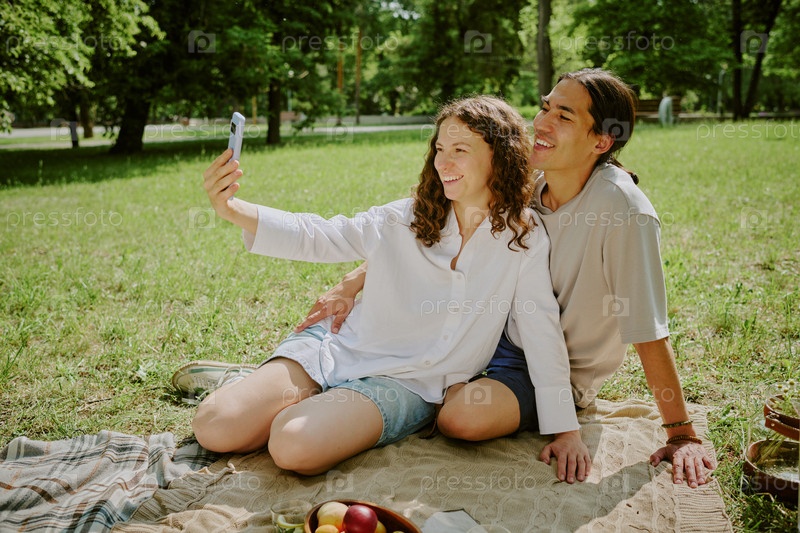 Молодая женщина и молодой азиатский мужчина делают селфи во время пикника на свежем воздухе