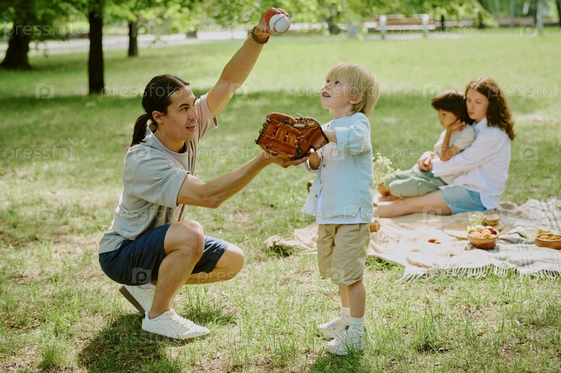 Отец учит молодого сына ловить бейсбол, в то время как семья отдыхает