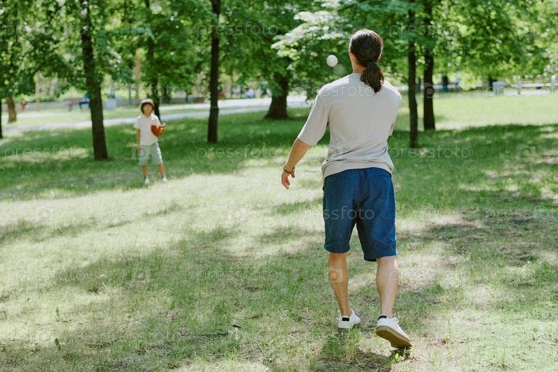 Отец играет в ловлю с маленьким ребенком на открытом воздухе в Грин-парке