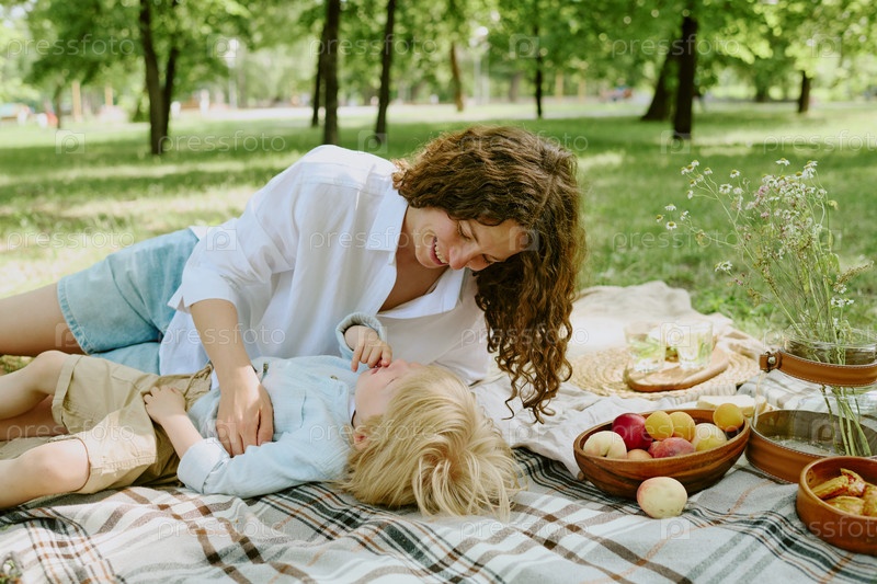 Молодая мать играет с сыном во время пикника в летнем парке
