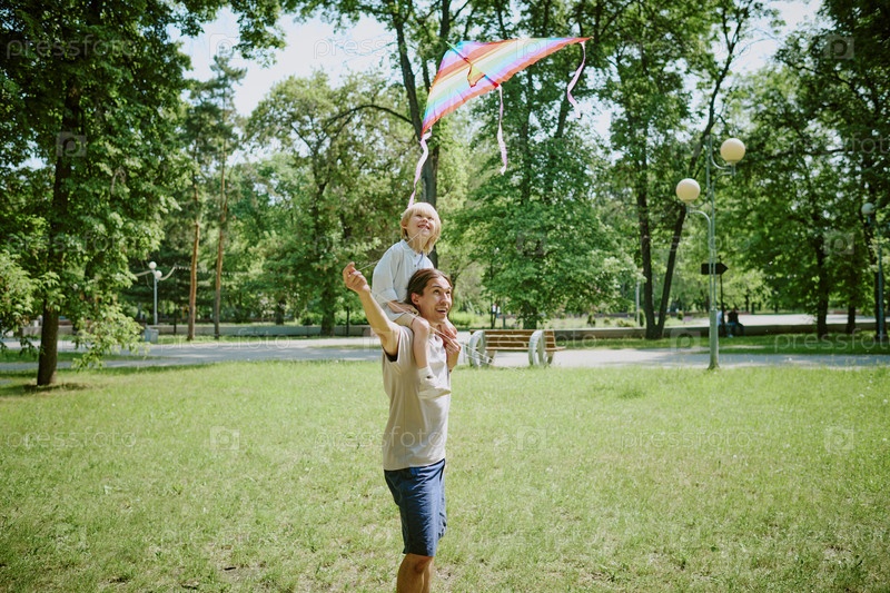 Молодой взрослый отец несет улыбающегося ребенка-мальчика, когда летает на воздухе