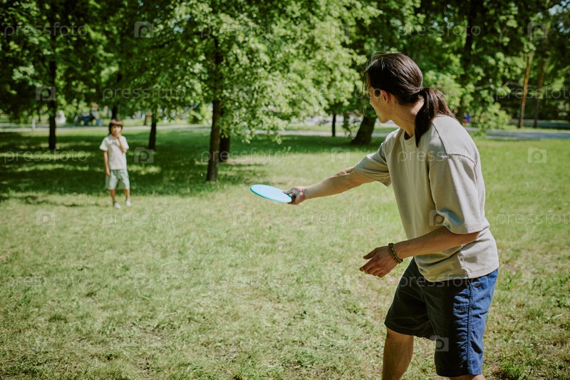 Отец играет в гребную игру с юным сыном на открытом воздухе в летнем парке