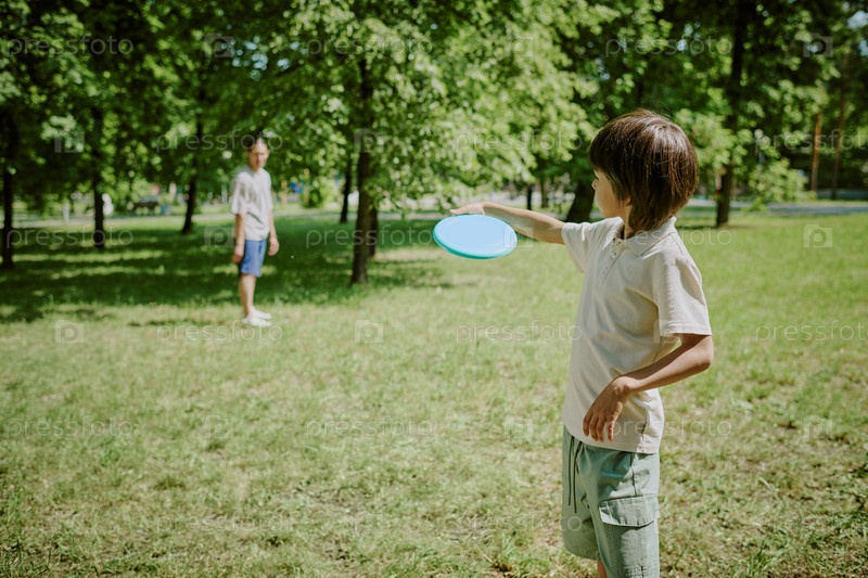 Отец и сын играют в фрисби вместе на открытом воздухе в Солнечном зеленом парке