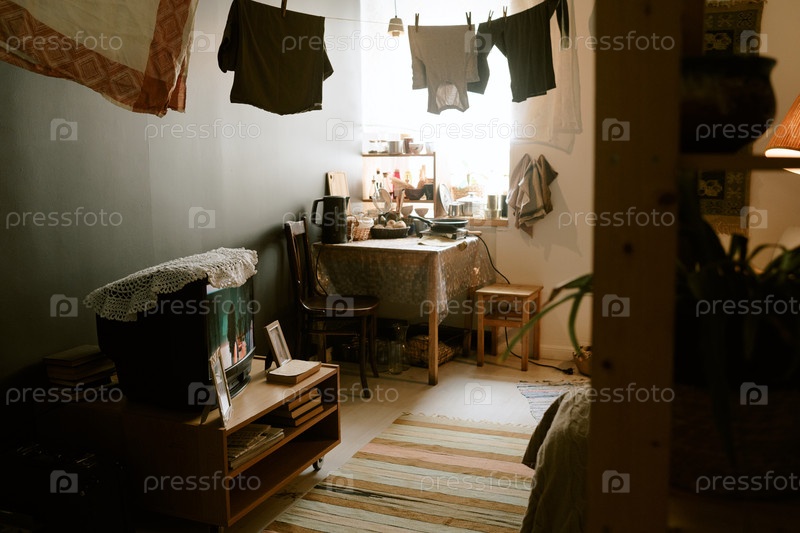 Уютный домашний интерьер с высушиванием белья в солнечной маленькой квартире