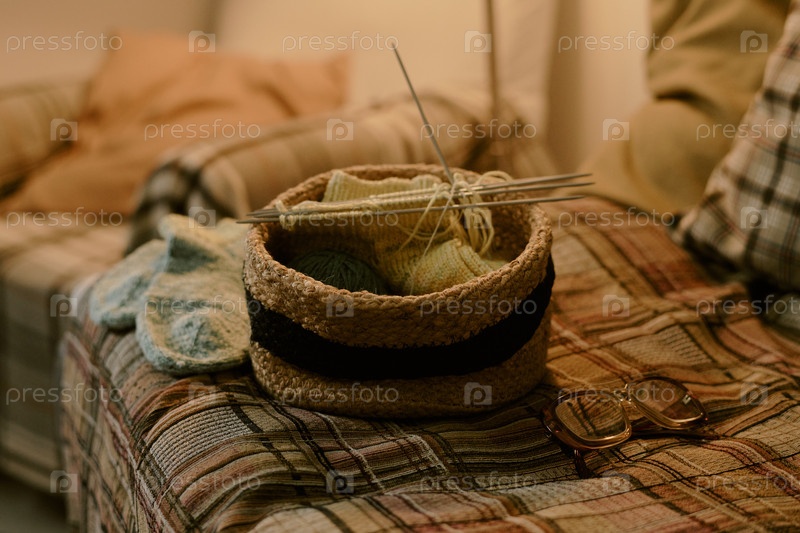 Иглы для вязания и пряжа, отдыхающие на диване в уютной домашней среде