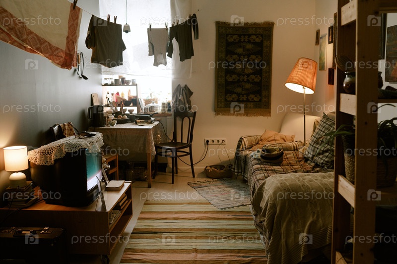 Уютный интерьер гостиной с сушилкой белья и теплым освещением окружающей среды