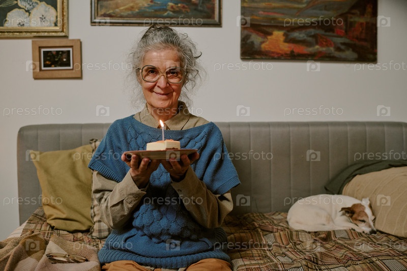 Портрет пожилой женщины, улыбающейся, держа рождественский торт в помещении