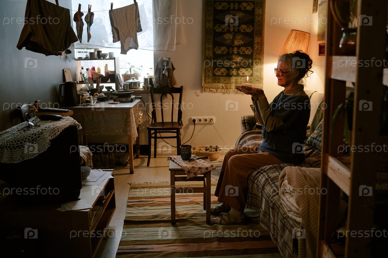 Пожилая женщина сидит в помещении и смотрит телевизор в скромном доме