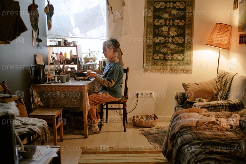 Пожилая женщина сидит одна в скромном доме, ест завтрак