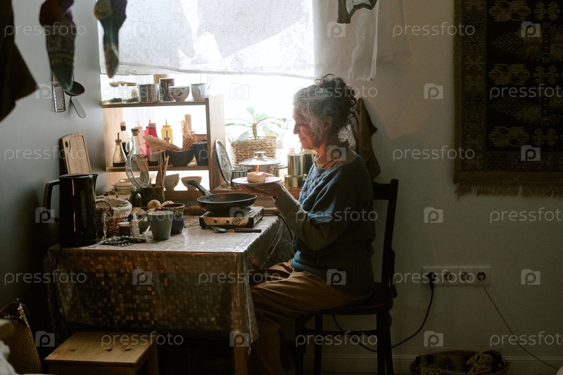 Пожилая женщина сидит одна, ест завтрак на скромной домашней кухне