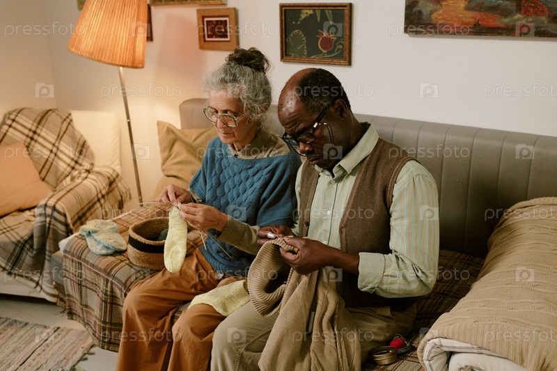 Старшая женщина и старший чернокожий мужчина вяжут одежду вместе в помещении
