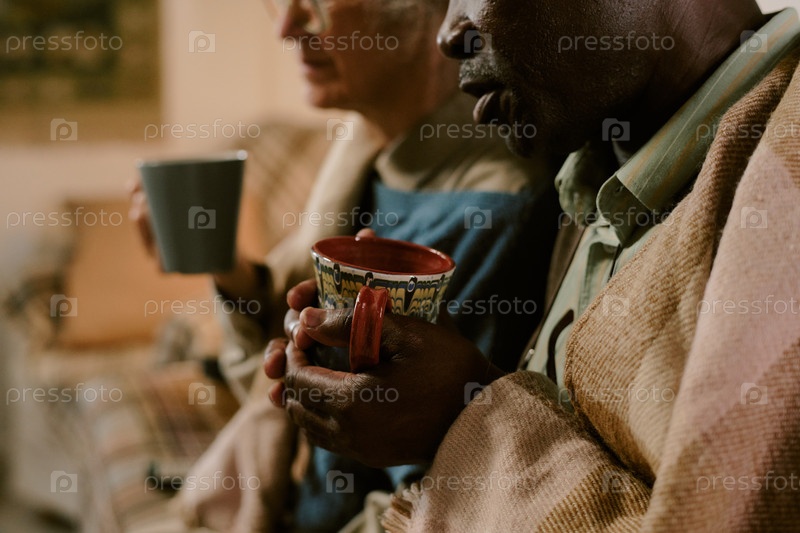 Старшая женщина и старший черный мужчина сидят вместе, пьют горячие напитки
