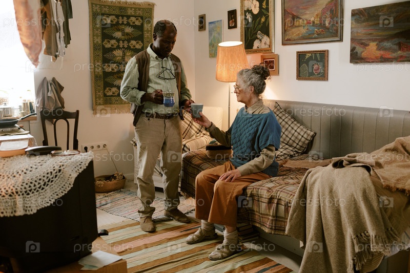 Старшая женщина и старший чернокожий мужчина делятся горячими напитками в уютной гостиной