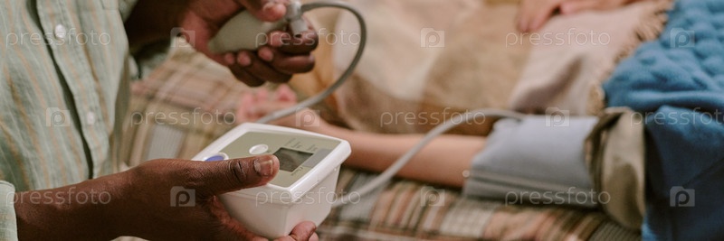 Пожилая пара получает проверку артериального давления во время гостевого медицинского визита