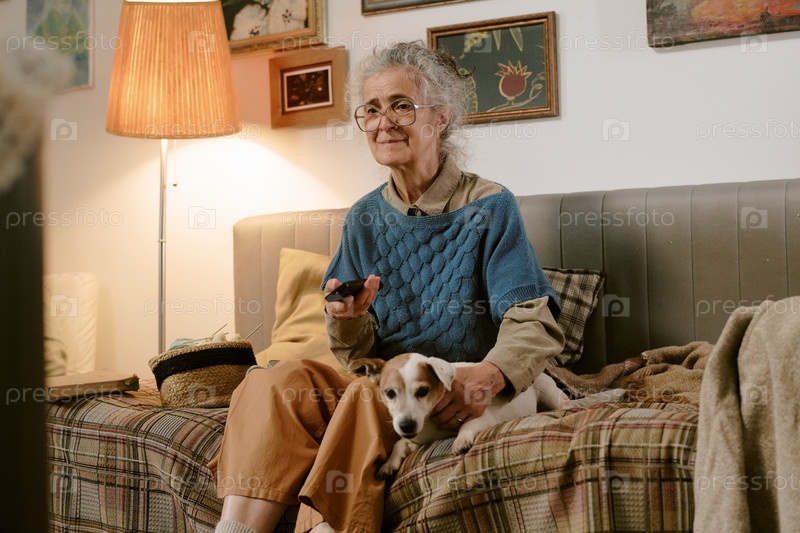 Женщина сидит в помещении, держит пульт дистанционного управления и ласкает старшего пса