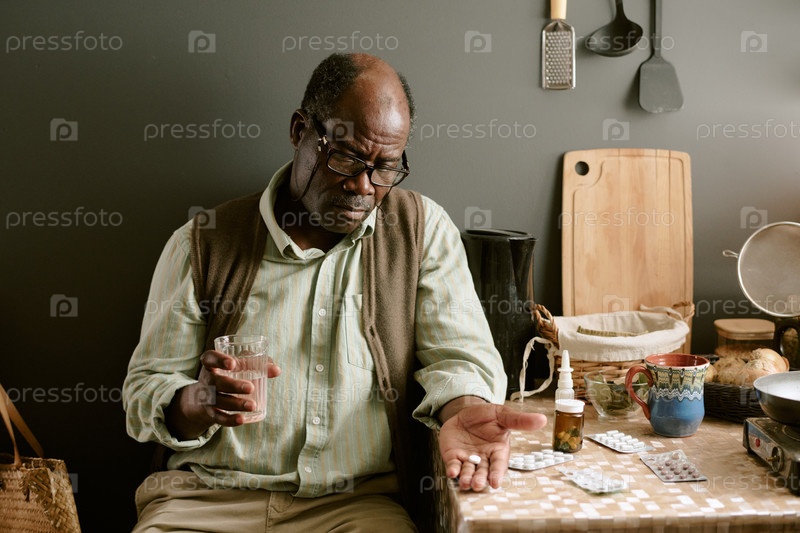 Старший чернокожий сидит за столом, принимает лекарства и держит стакан воды