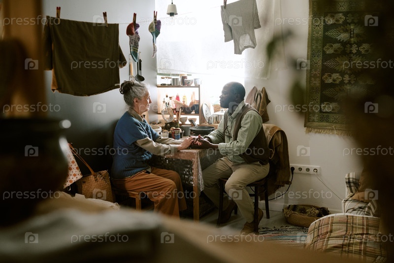 Мультиэтническая старшая пара сидит вместе, держась за руки в скромном доме