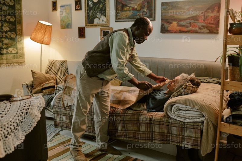 Мультиэтническая старшая пара, заботящаяся друг о друге в скромной домашней обстановке