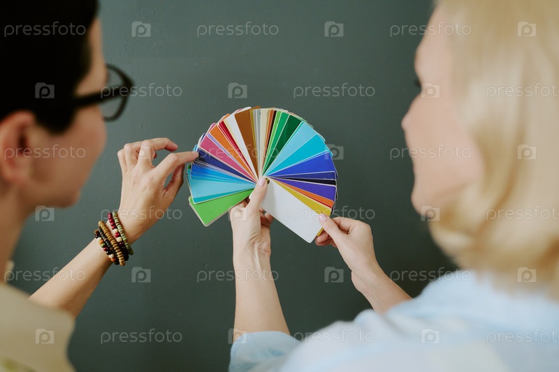 Две женщины сравнивают цветные образцы при выборе оттенков краски