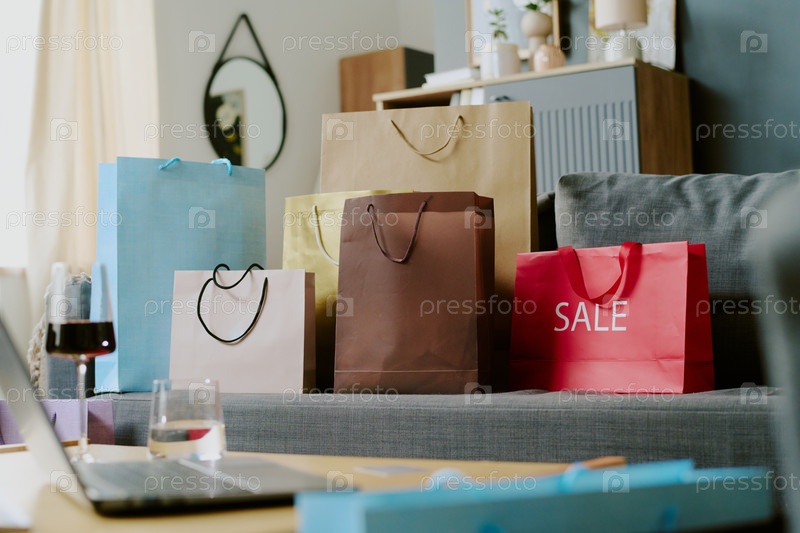 Красочные сумки для покупок, стоящие на диване во время домашней сессии онлайн-покупок