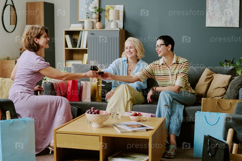 Группа женщин среднего возраста, наслаждающихся вином и общающихся в помещении