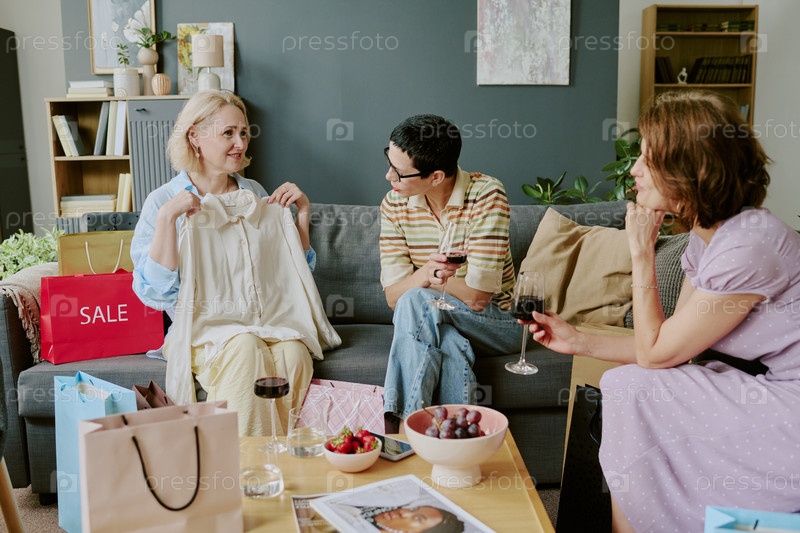 Женщина средних лет показывает блузку, общаясь с друзьями
