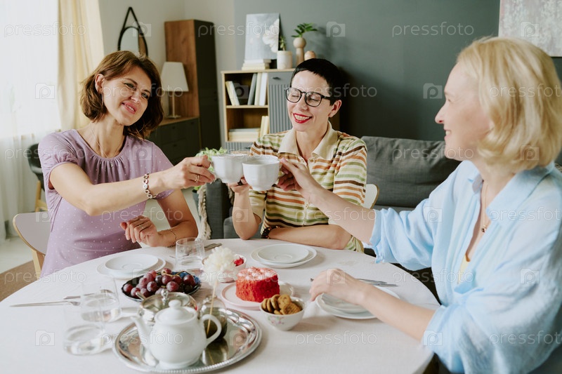 Три женщины среднего возраста, улыбающиеся во время тостов с чайными чашками в помещении