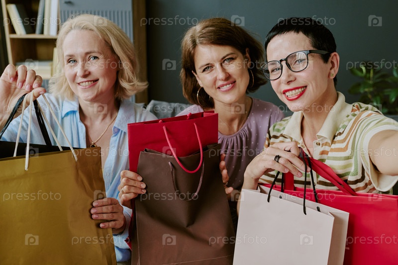 Три женщины среднего возраста, улыбающиеся в то время как они держат сумки для покупок внутри