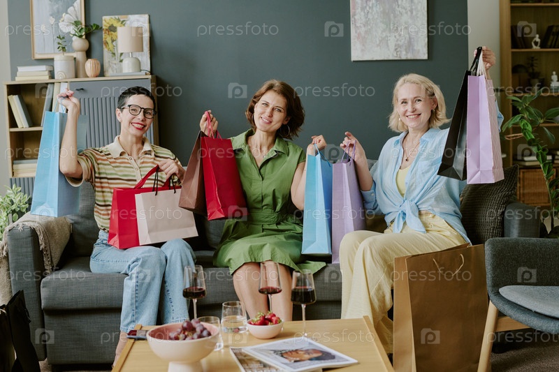 Три женщины среднего возраста, демонстрирующие сумки для покупок во время отдыха в помещении