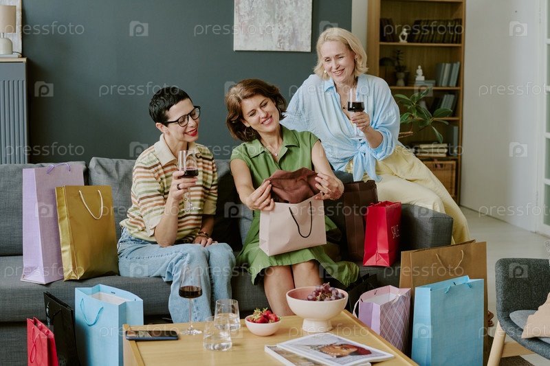 Три женщины среднего возраста смеются, делясь опытом покупок