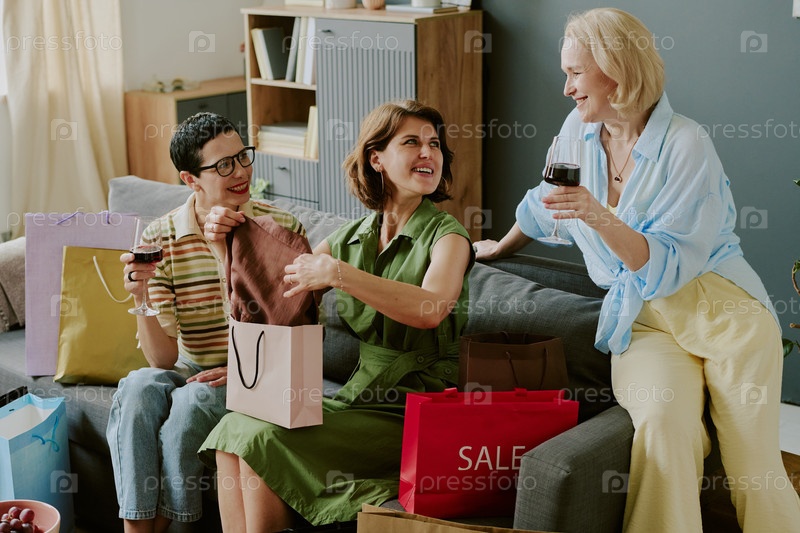 Группа женщин среднего возраста, получающих удовольствие от покупок и питья вина в помещении