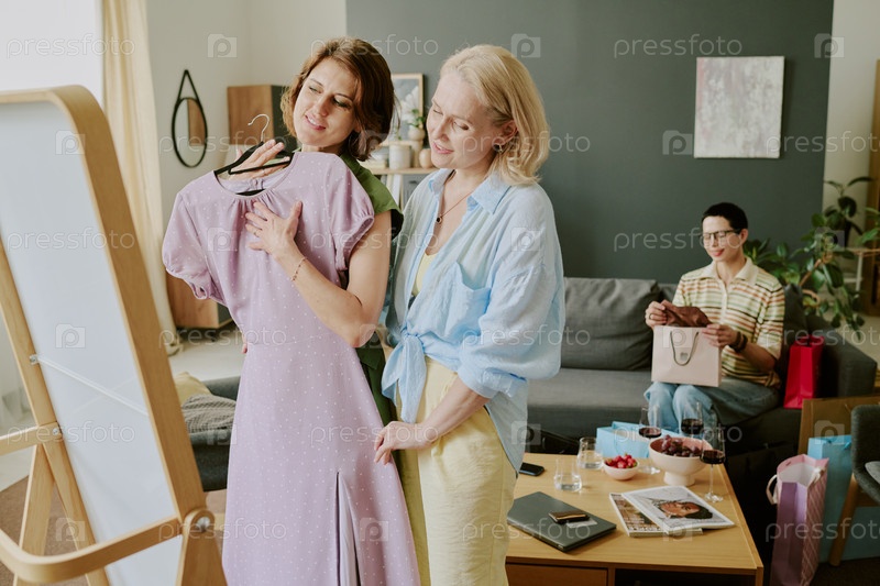 Женщины среднего возраста пробуют платье перед подругами