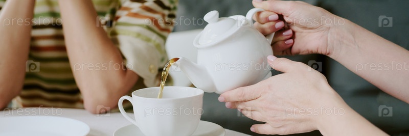 Женщина, наливающая приятелю чай во время расслабляющего разговора