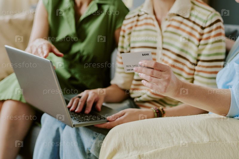 Молодые взрослые женщины делают онлайн-платежи с помощью ноутбука и кредитной карты в помещении