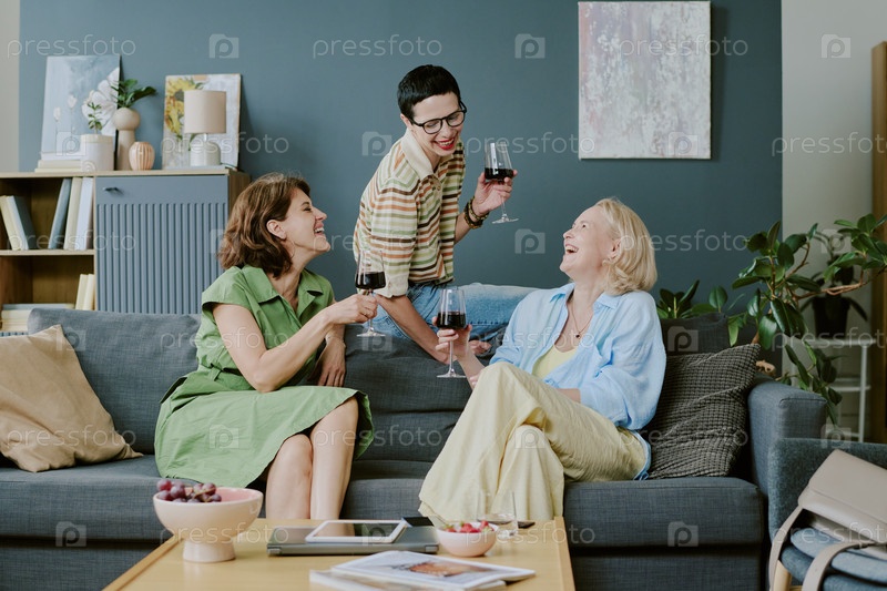 Три женщины общаются и смеются, пьют красное вино