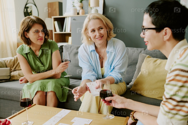 Женщины среднего возраста играют в карточную игру и пьют красное вино внутри дома