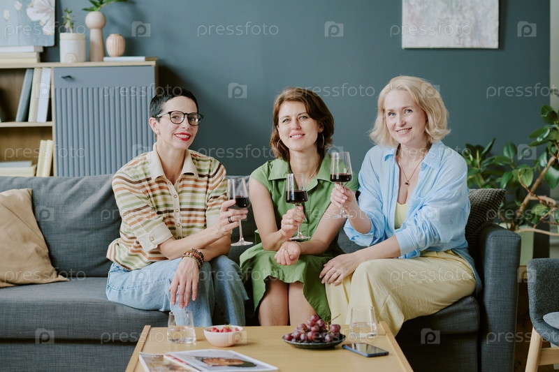 Три женщины среднего возраста, улыбающиеся во время тостов со стаканами красного вина