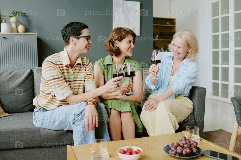 Три женщины среднего возраста улыбаются и приносят тосты за красные бокалы