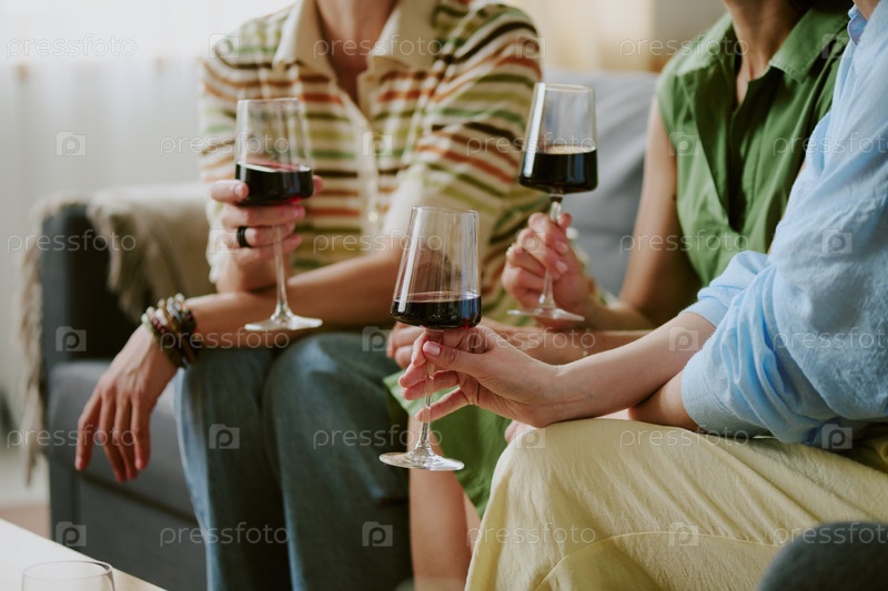 Группа молодых взрослых женщин, расслабляющихся в помещении и пьющих красное вино вместе