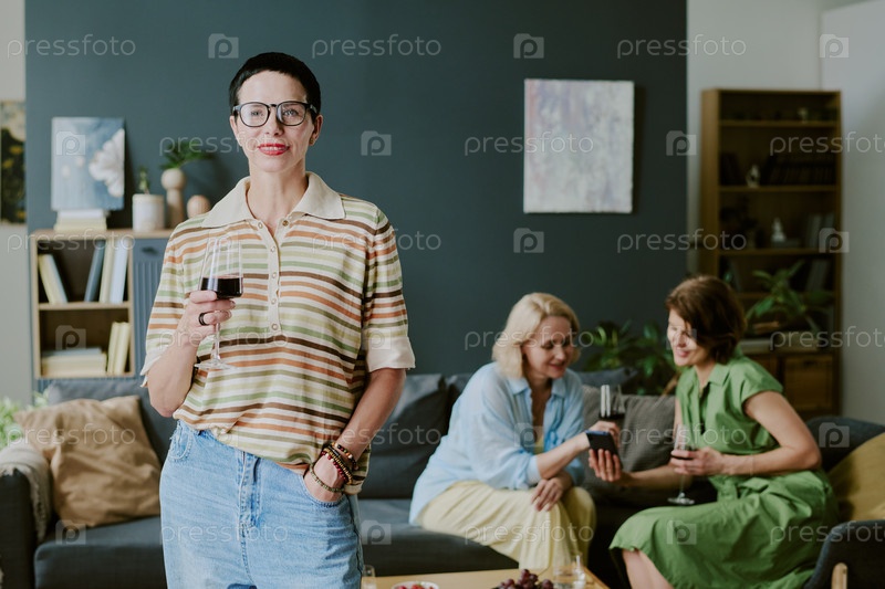 Портрет женщины среднего возраста, держащей бокал вина на общественном собрании