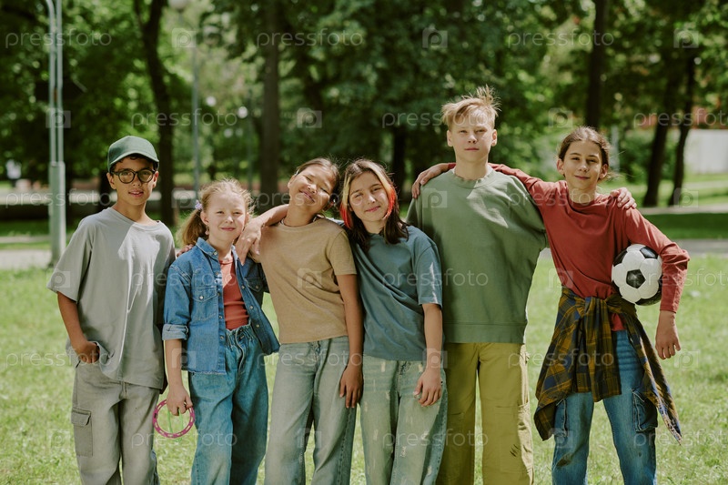 Группа многонациональных школьников, стоящих вместе и улыбающихся в парке на открытом воздухе