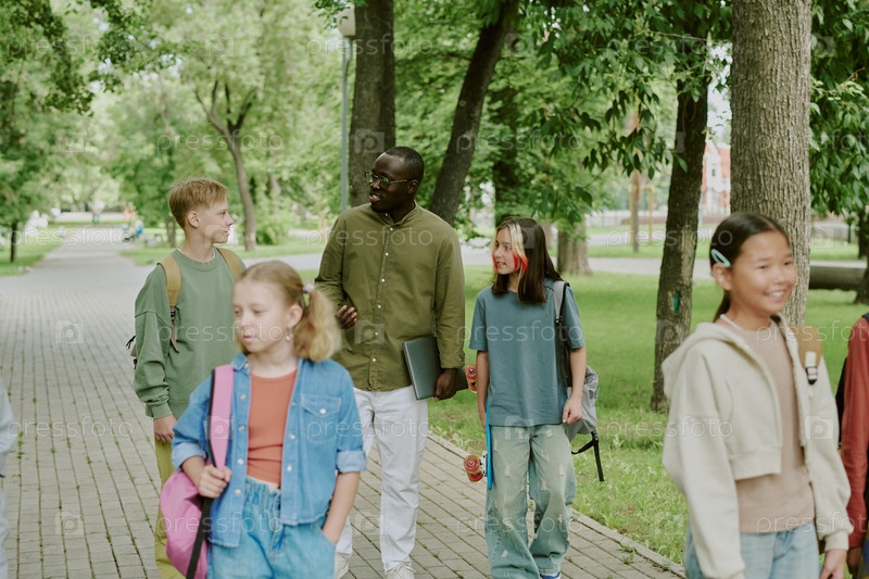 Разнообразная группа детей и чернокожий учитель ходят вместе в парке