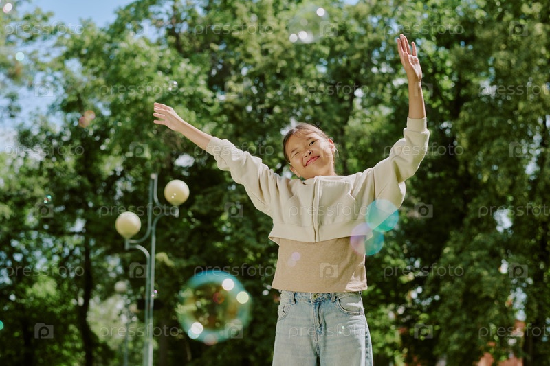 Девушка улыбается и поднимает руки, стоя на улице в парке
