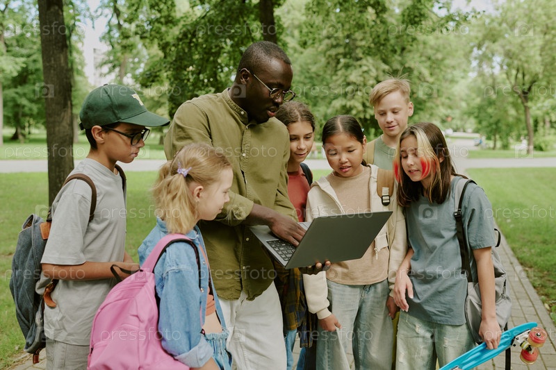 Мультиэтнический школьный учитель Руководящая группа детей, обучающихся на открытом воздухе в парке