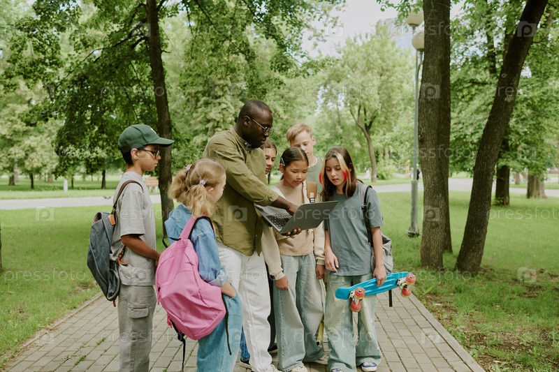 Многонациональные дети слушают учителя-мужчину, объясняющего урок в парке