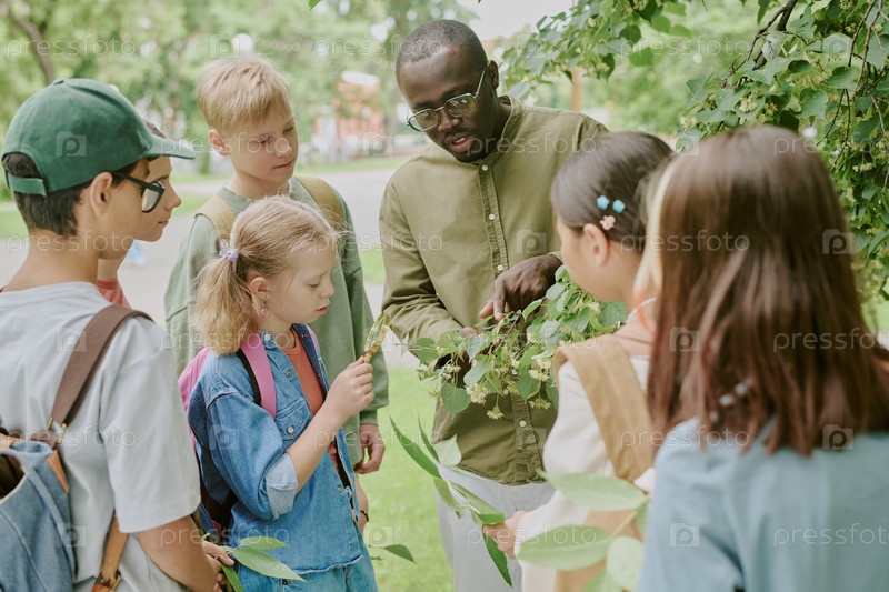 Мультиэтническая школьная учительница направляет детей исследовать природу на открытом воздухе в парке
